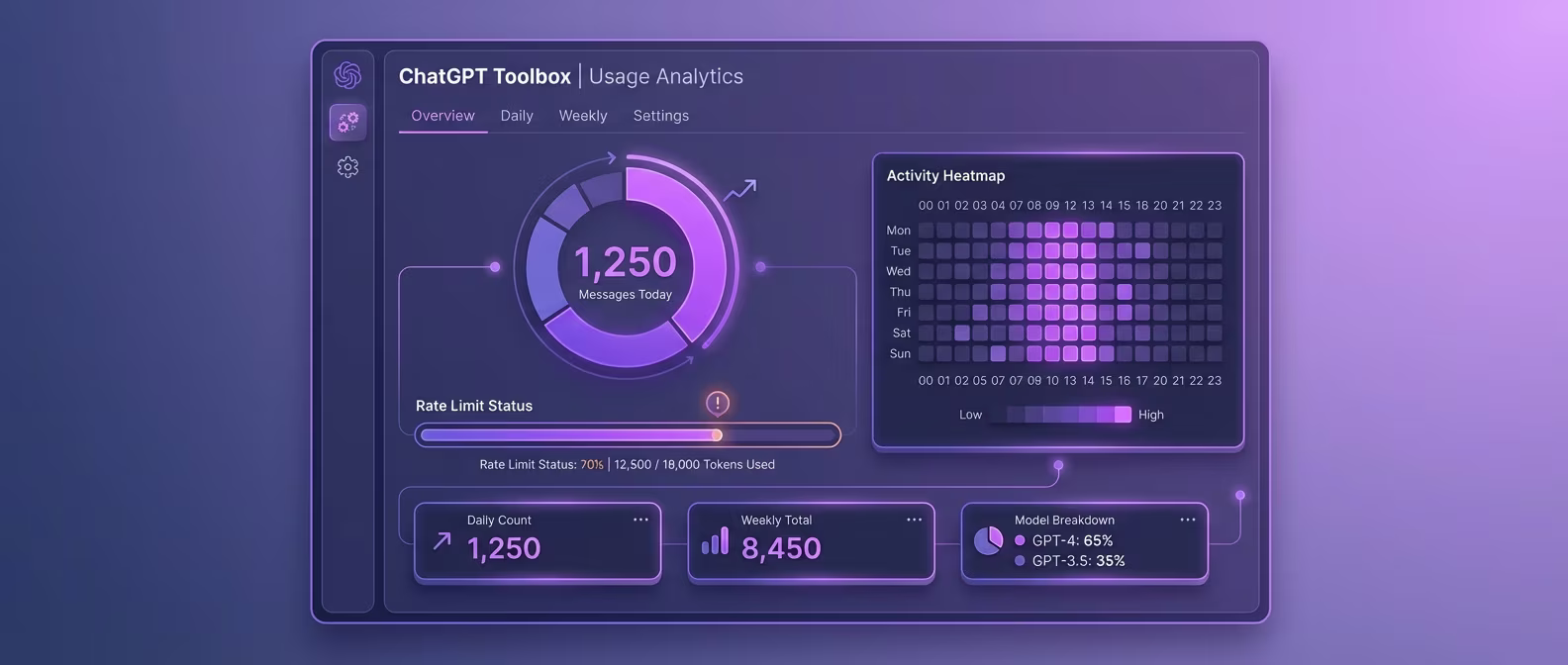 ChatGPT Toolbox's usage tracker monitors your ChatGPT activity in real time, displaying daily message counts, rate limit status, and historical usage patterns directly inside ChatGPT's interface.